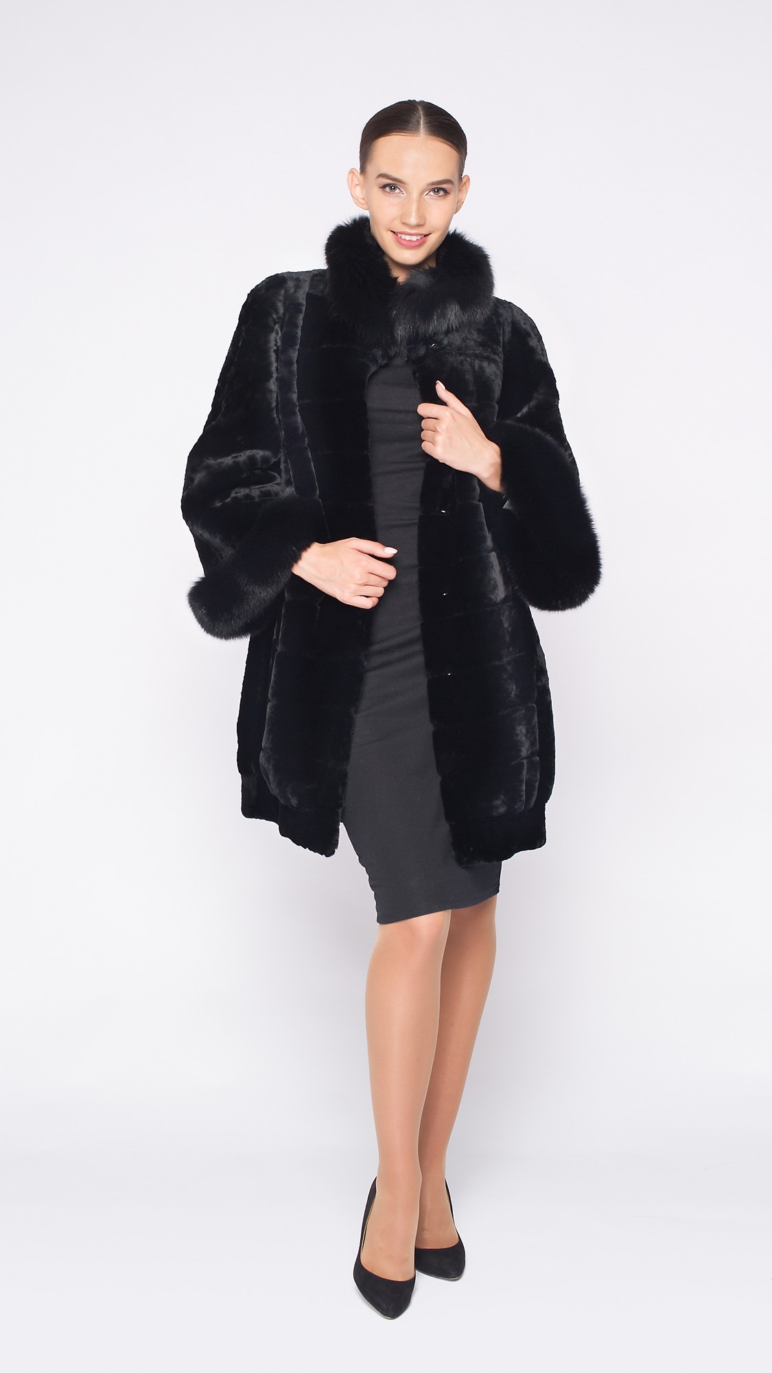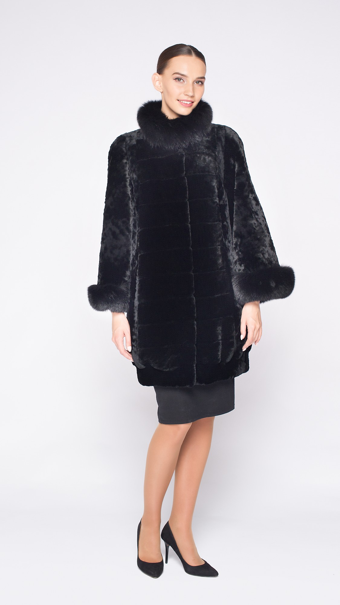 Очень теплая шуба из овчины с интересными деталями в виде манжетов и воротника. Черный песец гармонично разбавляет строгое классическое пальто — образ получается женственный и стильный.