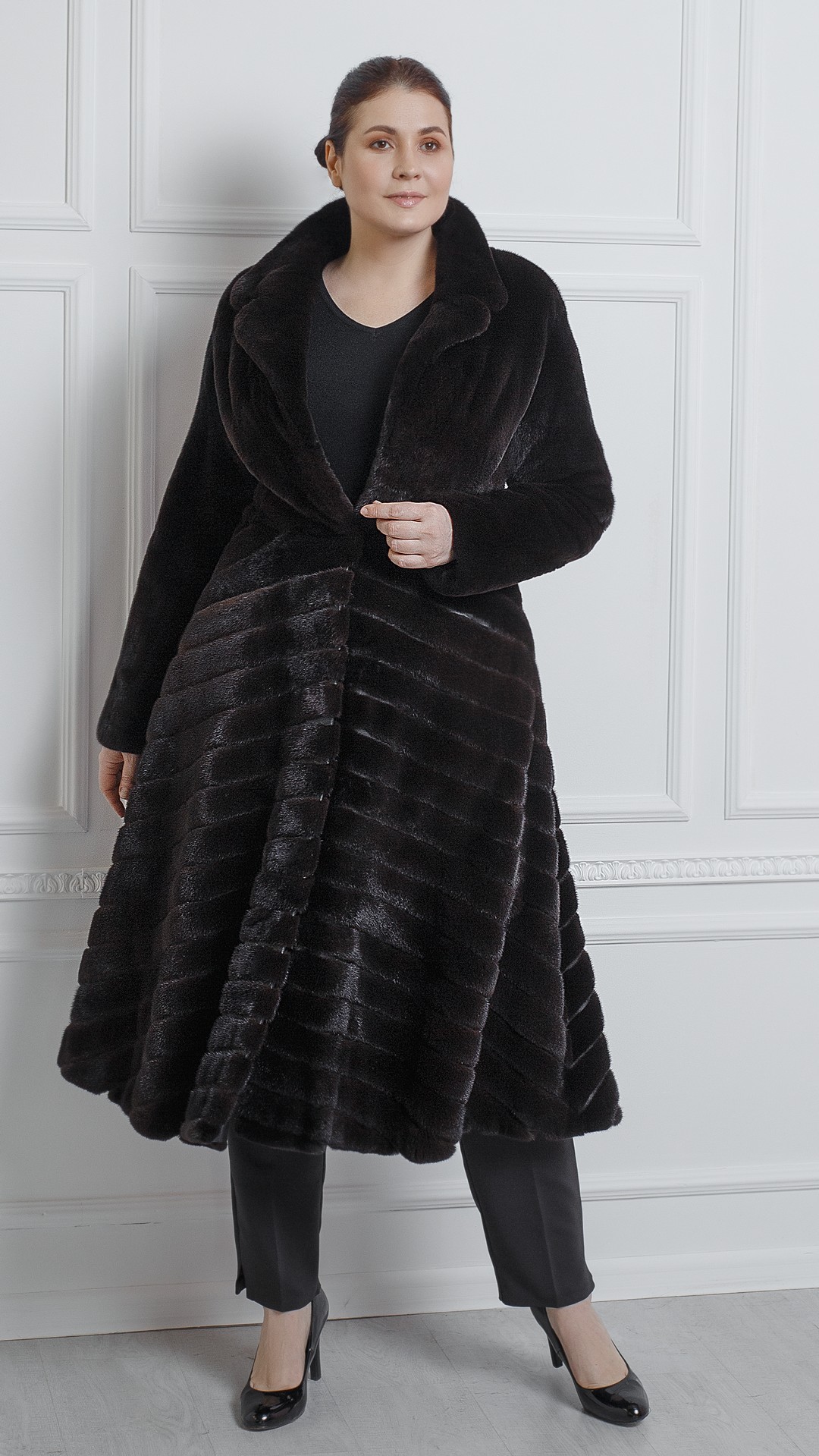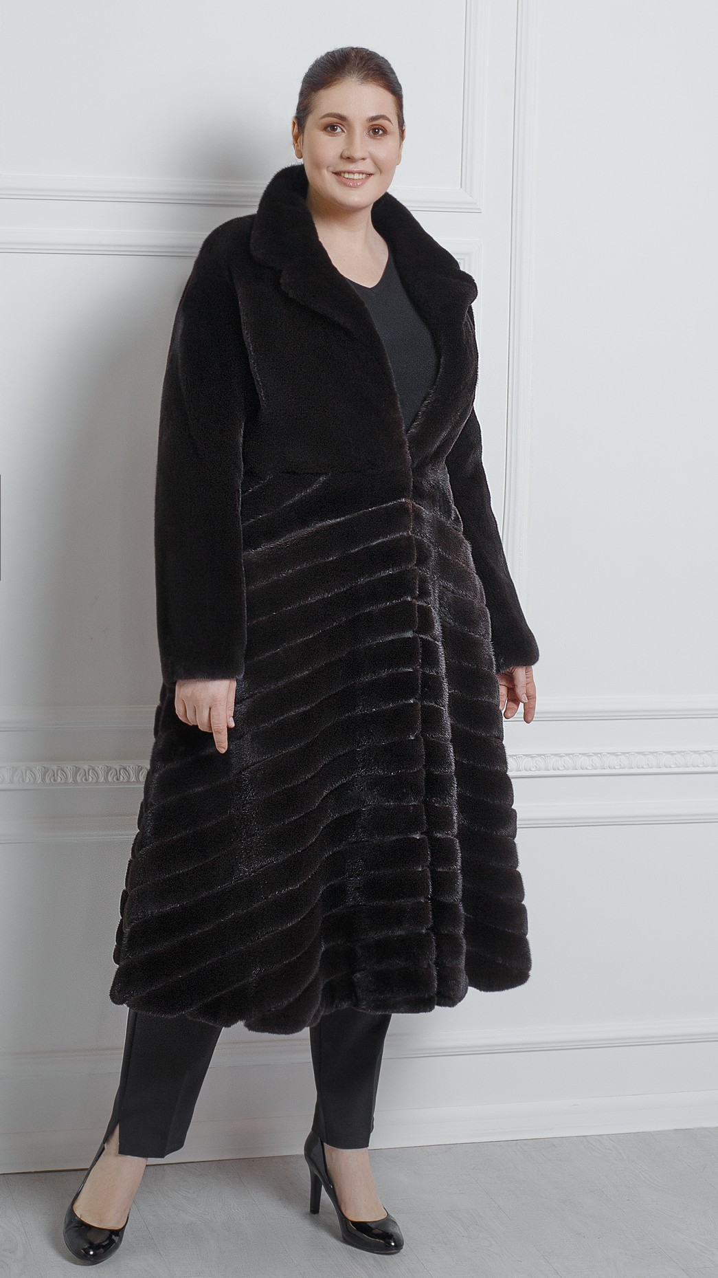 Шикарное длинное пальто из блэкгламы с английским воротником, приталенным силуэтом и эффектной юбкой. Оттенок очень похож на цвет нефти — отливает коричневатым оттенком. Ворс короткий — шуба на ощупь плюшевая. Во время холодов воротник всегда можно застегнуть на крючок, чтобы закрыть шею.