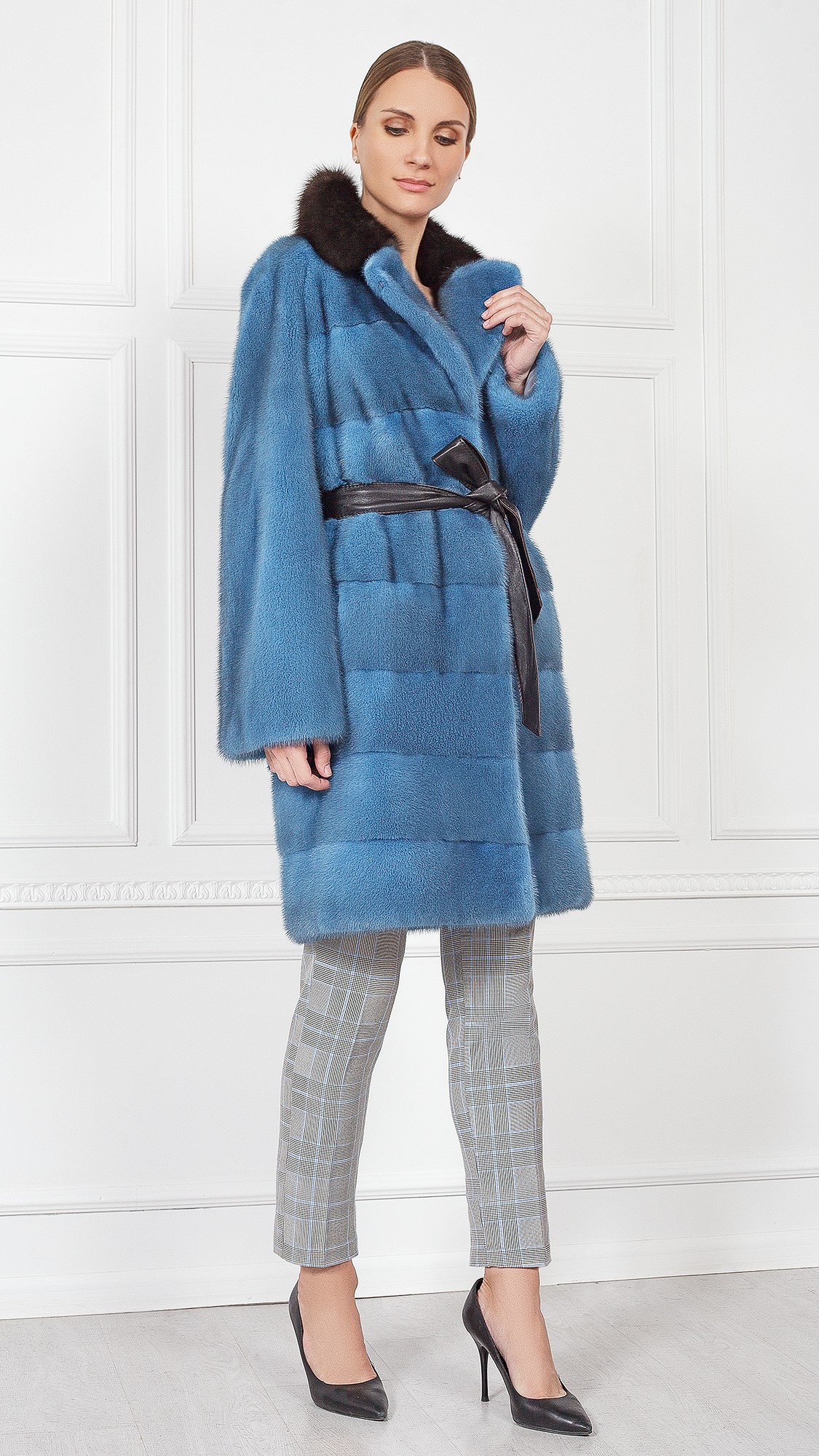 Шуба из меха норки, отделка куница
