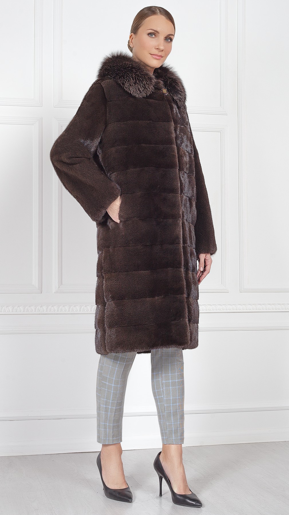 Шуба из меха норки, отделка блюфрост