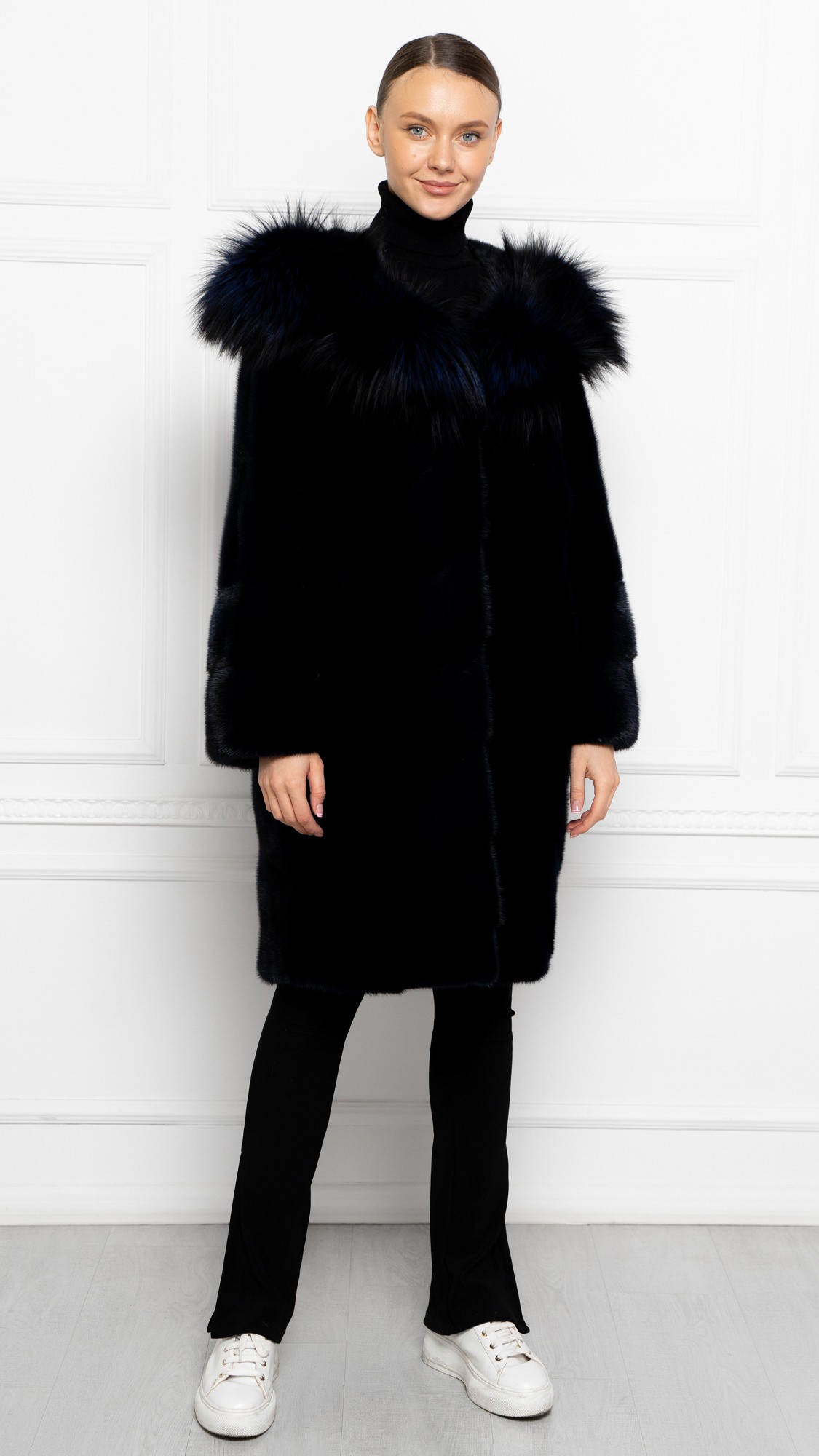Шуба из меха норки, отделка чернобурая лиса